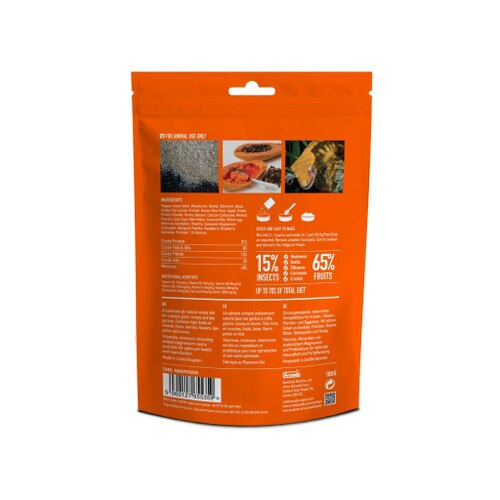 Papaya, Insect Meal (Mealworm, Beetle, Silkworm, Black Soldier Fly Larvae, Cricket), Brown Rice Flour, Apple, Potato Protein Powder, Honey, Banana, Calcium Carbonate, Mineral Powder, Guar Gum, Bee Pollen, Coconut Milk, Whole egg, Hibiscus, Dandelion, Rosehip, Seaweed, Magnesium Carbonate, Marigold, Paprika, Raspberry, Blueberry, Spirulina, Probiotic*, B Vitamins.